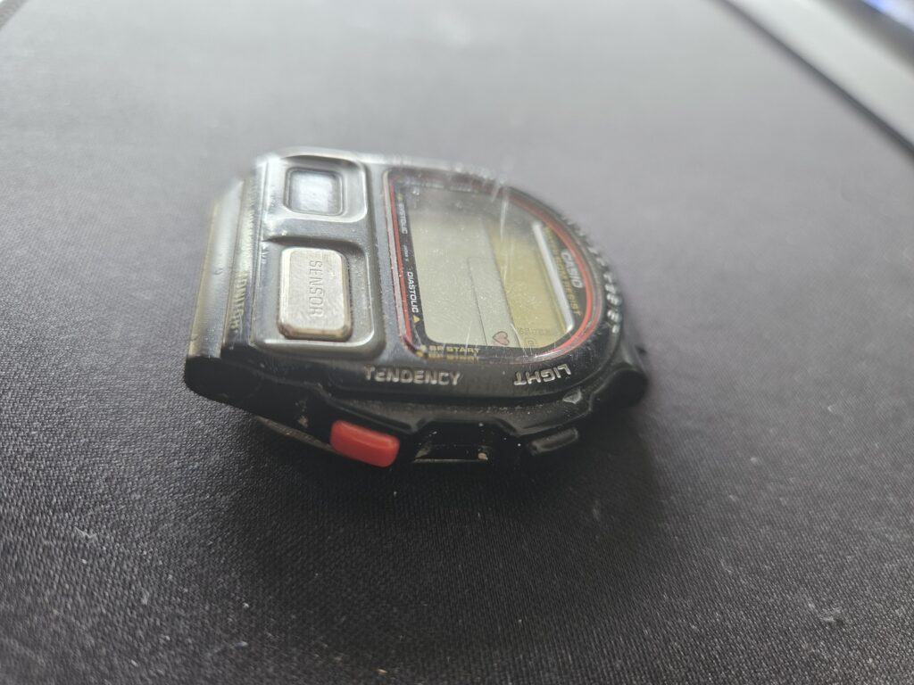 The watch I found was in poor condition. The strap was missing, the battery was dead, and the case had a lot of grime, especially around the sensor pads. The acrylic crystal was badly scratched and had lost its clarity.