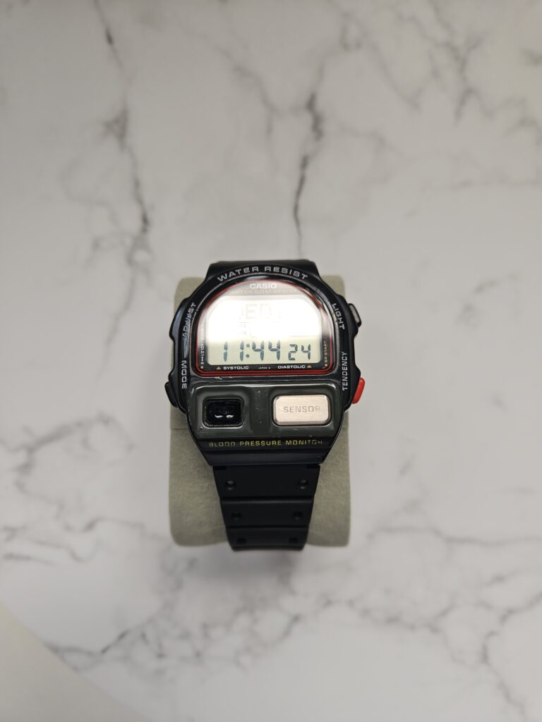 The Casio BP-100 came out in the early 1990s and was one of Casio’s boldest health-focused watches. It used small metal sensors on the front and caseback to let the wearer check blood pressure and pulse. For its time, it was a very ambitious design and quickly became a talking piece among collectors.