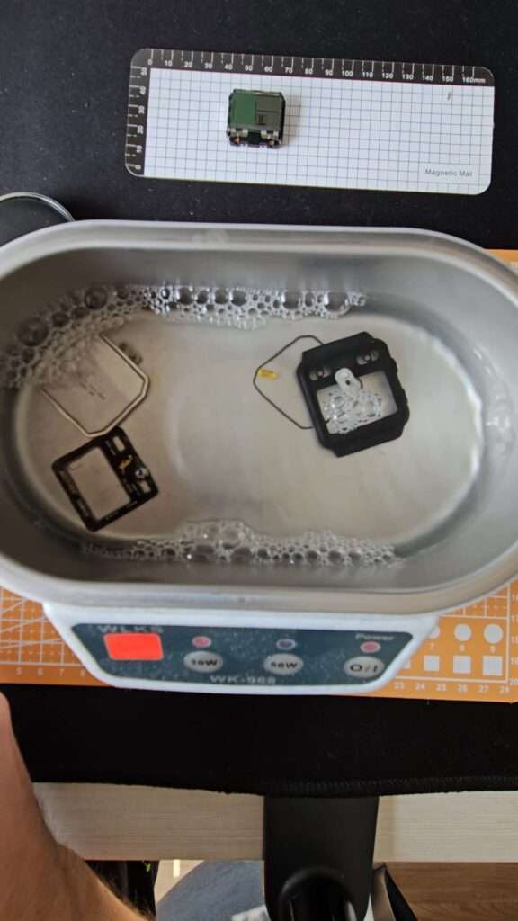 I disassembled the watch and cleaned everything with IPA (isopropyl alcohol). After reassembly, the module still didn’t work. The problem turned out to be mechanical. Too much play between the module, the plastics, and the metal clips meant the PCB wasn’t pressing firmly enough against the zebra strips. Carefully bending the clips to create a tighter grip sorted it. A few attempts later, the module was running correctly. 😅