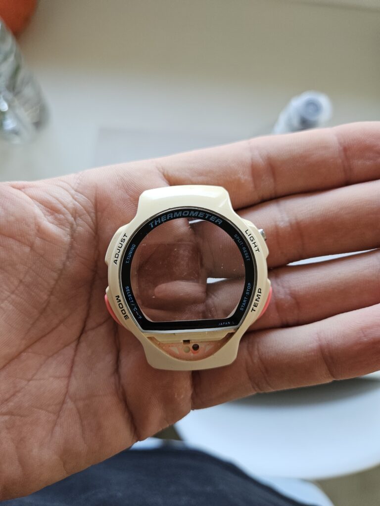 The biggest surprise was on the case itself: someone had painted the lower part of the front black, probably to hide yellowing or scratches. The once-white resin had dulled over time, and the acrylic glass was full of visible scratches.